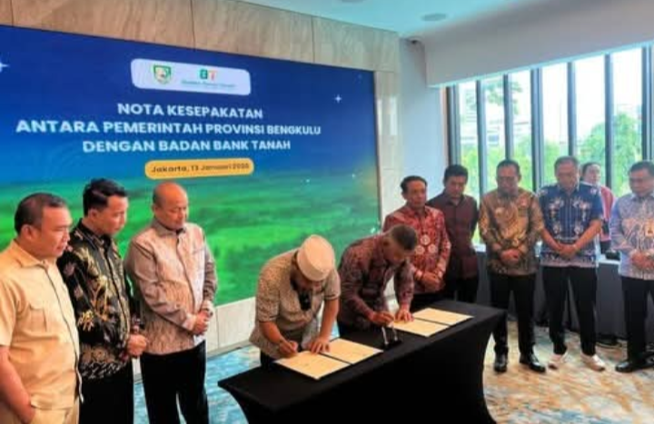 KLIKINFOBERITA.COM,- Pemerintah Provinsi Bengkulu menandatangani Nota Kesepahaman (MoU) dengan Badan Bank Tanah di Hotel Sari Pacific, Jakarta, Selasa (13/1). Kerja sama strategis ini menargetkan optimalisasi lahan bekas Hak Guna Usaha (HGU) yang habis masa berlakunya, untuk mendongkrak pembangunan daerah dan membuka sumber Pendapatan Asli Daerah (PAD) baru tanpa membebani masyarakat kecil.