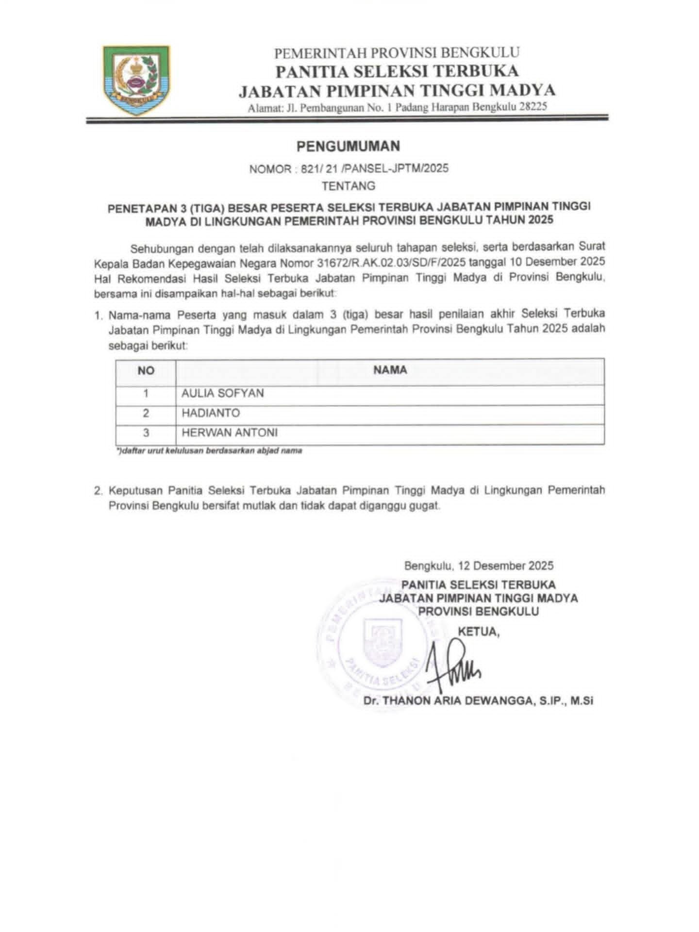Pengumuman didasarkan pada Surat Kepala Badan Kepegawaian Negara (BKN) Nomor 3167/2R.AK.02.03/SDF/12/2025 tanggal 10 Desember 2025. Dokumen tersebut merinci hasil rekomendasi seleksi JPT Madya di lingkungan pemprov. Panitia menetapkan tiga nama unggulan yang memenuhi semua syarat administratif, kompetensi, dan integritas, diurutkan secara abjad: