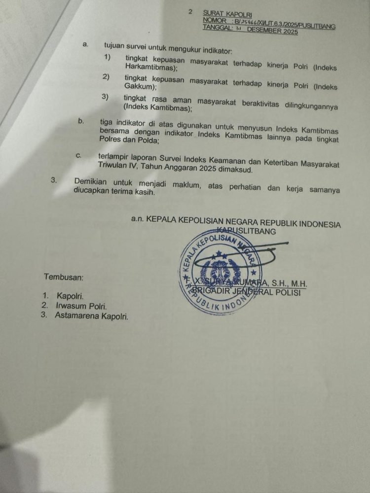 KLIKINFOBERITA.COM,-Polres Bengkulu Tengah sukses mencuri perhatian dengan menyabet peringkat pertama dalam Survei Indeks Keamanan dan Ketertiban Masyarakat (Kamtibmas) se-Polda Bengkulu. Prestasi gemilang ini diumumkan melalui surat resmi Kapolri via Kapuslitbang Polri bertanggal 31 Desember 2025, menjadikan Polres Bengkulu Tengah sebagai yang terdepan dengan nilai total mencapai 278,27 jauh melampaui satuan wilayah lainnya.