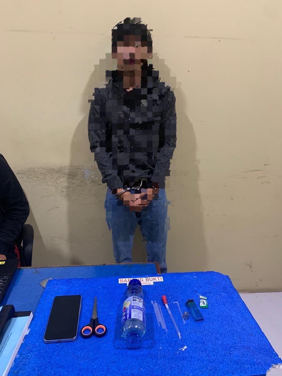 Dalam penggeledahan, polisi mengamankan AA yang sedang berada di kamar sendirian. Tersangka tampak panik saat tim masuk, tapi langsung diamankan tanpa perlawanan. Barang bukti yang disita mencakup satu kaca pyrex berisi kristal sabu sabu golongan I (non-tanaman), satu set bong dari botol Mizone yang telah dimodifikasi lengkap dengan dua pipet bengkok, satu korek api warna biru yang sudah diubah fungsinya, serta satu unit ponsel Infinix Smart yang diduga digunakan untuk koordinasi pembelian.